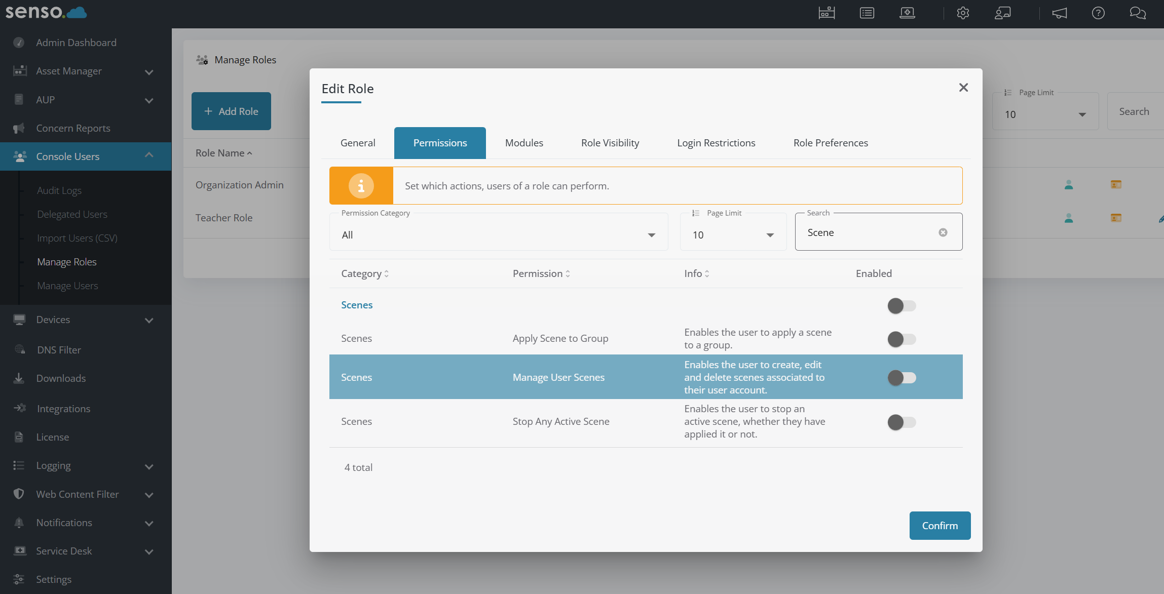 There is an additional permission, Stop All User Scenes, which enables users with this role to stop Scenes applied by other users
