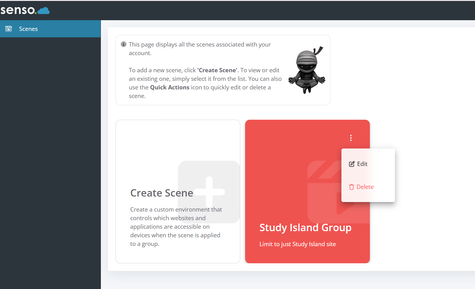 The Scenes landing page displays a list of all Scenes associated with the user's account for the