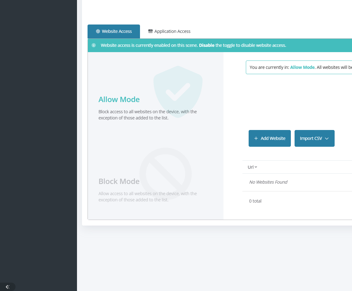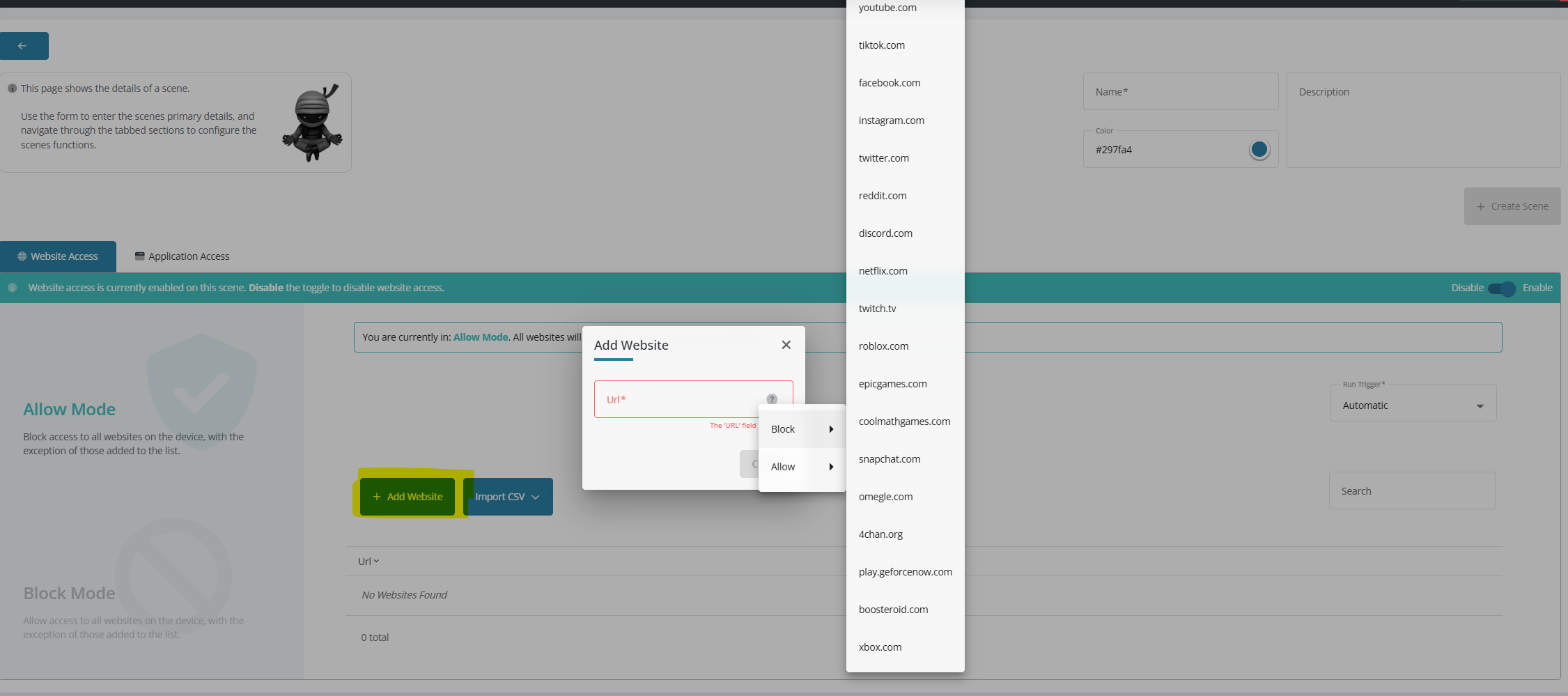 Allow Mode: This can be used to create a list of websites that can be accessed during class. When the Scene is applied and Website Access is enabled, devices with the Scene applied can only visit websites on the approved list. All other
