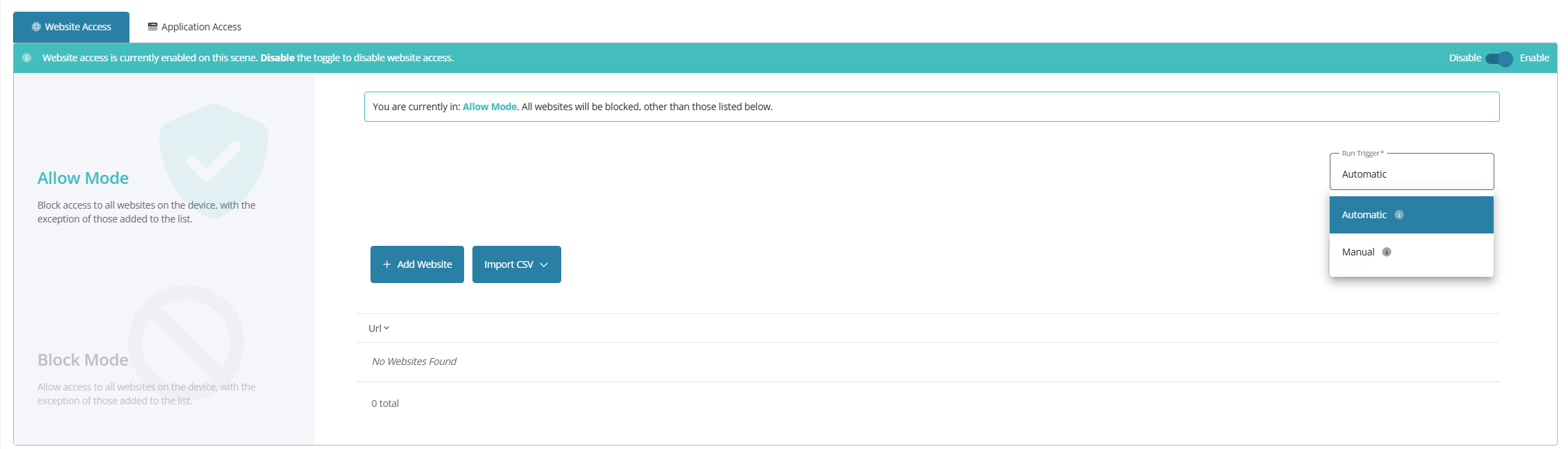 Disable: Deactivates Website Access functionality, so no website restrictions will apply during the Scene.
