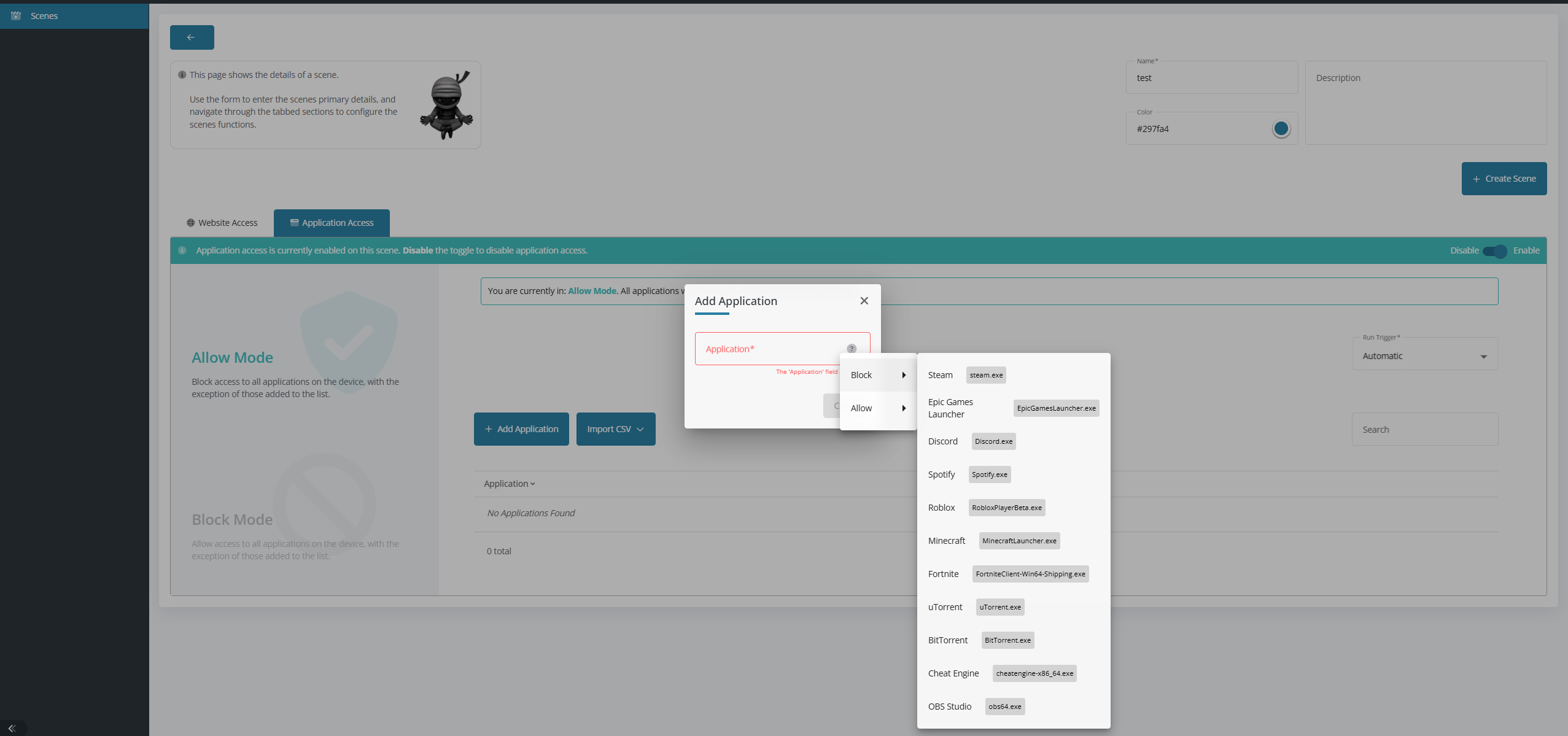 Block Mode For Application Access: This can be used to create a list of applications that can be blocked during class. When the Scene is applied and Application Access is enabled, devices with the Scene applied can freely use all applications except those on the blocked list.
