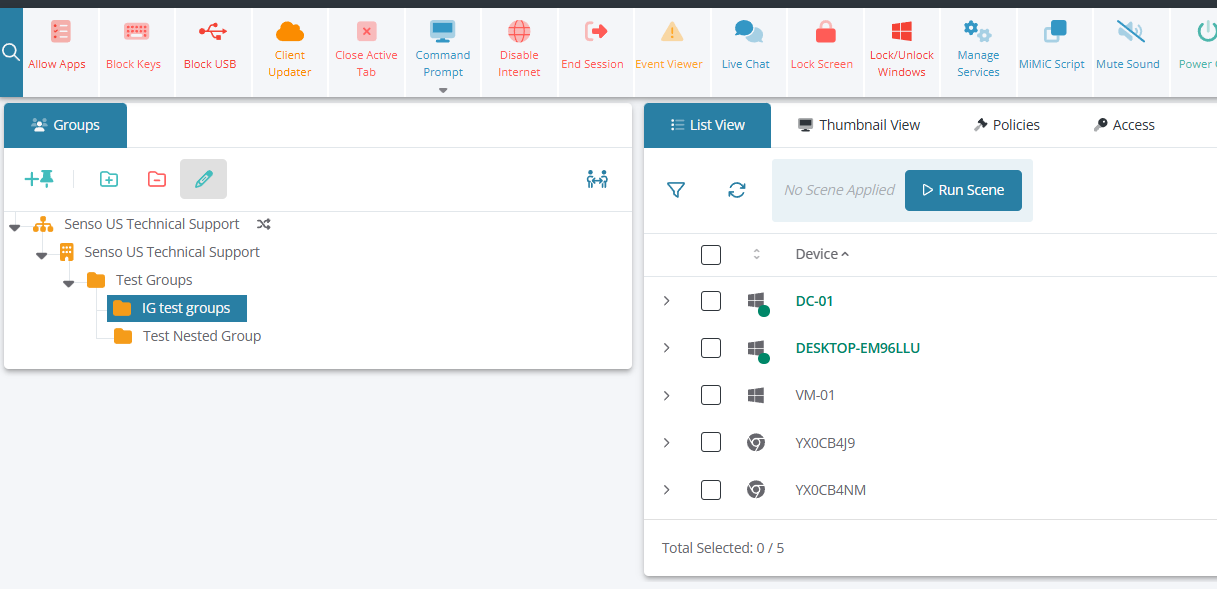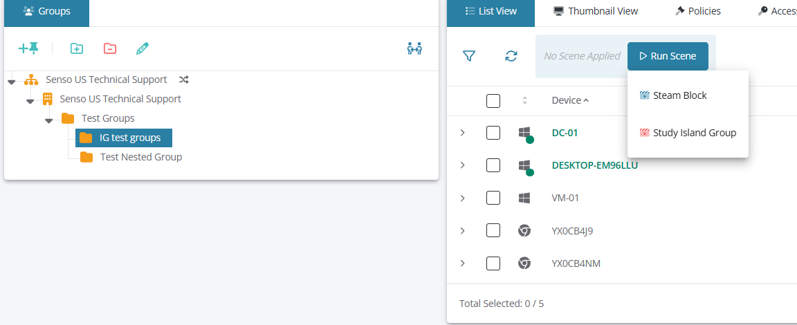 Navigate to the Main Senso Console and choose a group to highlight to apply a scene either in List View or Thumbnail View