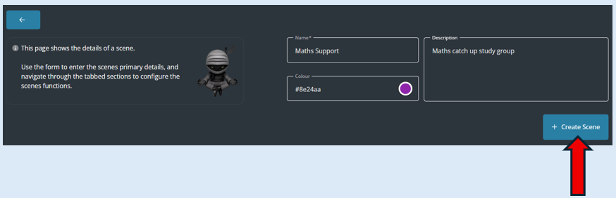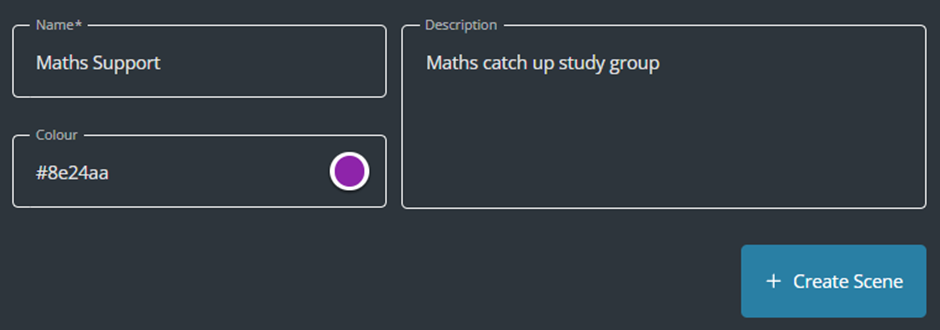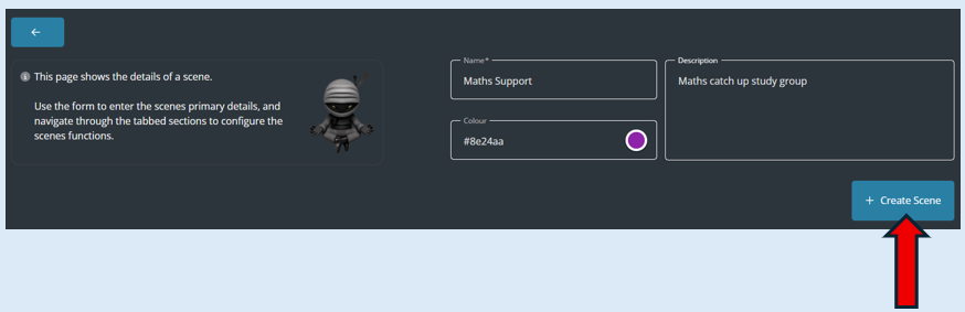 Enter in the scene name, you can choose the background colour (Optional) and add in a description about the scene (Optional).
