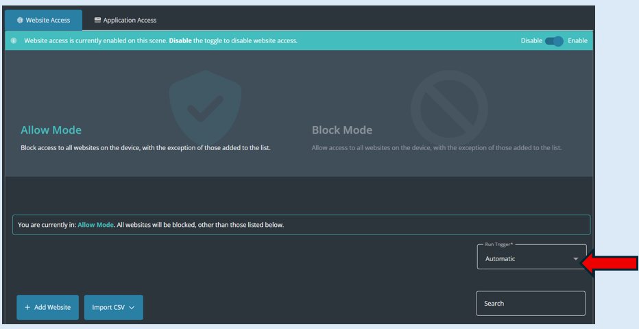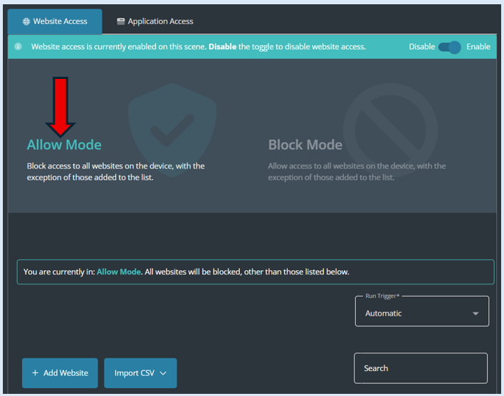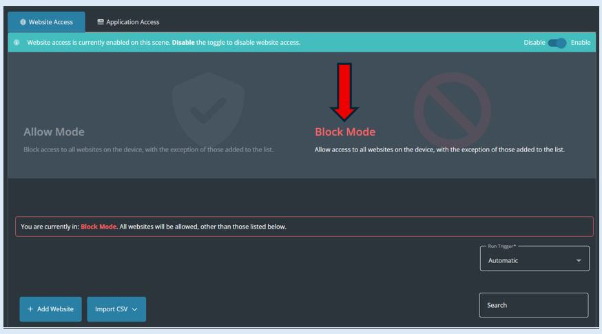 Before you can select the ‘Block Mode’ option, you will need to toggle the Website Access button to the ‘Enable’ position.