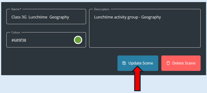 Top Tip – Always set the ‘End Time’ to the time that your session/lesson ends otherwise the scene will continue to run and could affect the users/devices until the scene closes.
