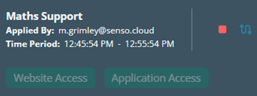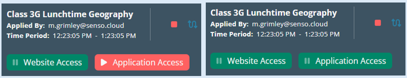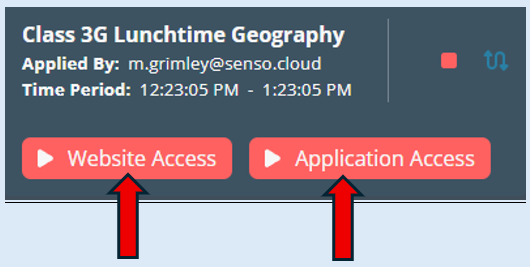Once you have selected the scene, have set the ‘End Time’ clicked on ‘Run’, the scene information will appear as shown previously however you will notice that the ‘Website Access’ and ‘Application Access‘ buttons are red rather than green.