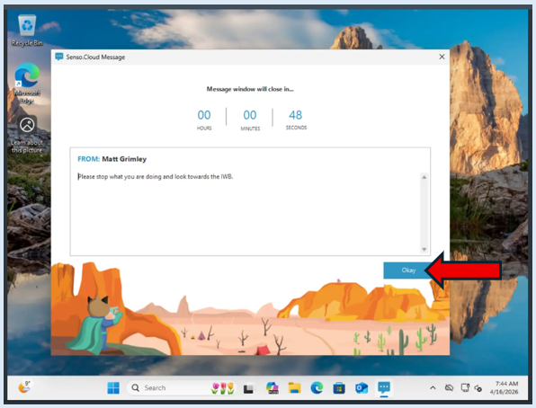 The message will stay visible on the user’s screen until the timer has counted down however the user can close the window by selecting the ‘Okay’ button.