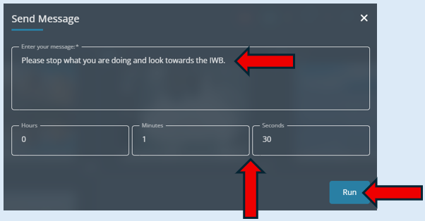 Enter in the message that you would like to send to the users and then decide how long the message will stay on the user’s screens for. Select ‘Run’.