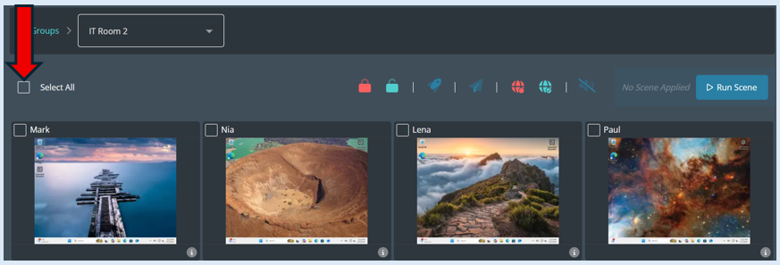 Rather than muting the speakers on a device you have the ability to set the speaker volume. To do this, select the devices that you want to action against by ticking the relevant thumbnails or if it is for the whole group click the ‘Select All’ icon.