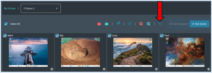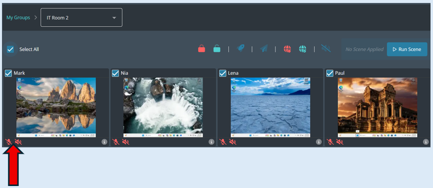 To mute the speakers and/or the microphone for every device in the group, first you will need to click on the ‘Select All’ icon.