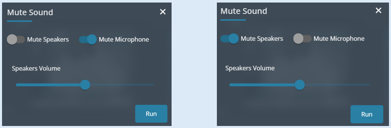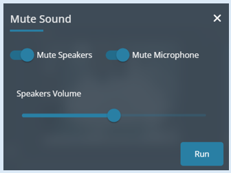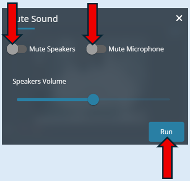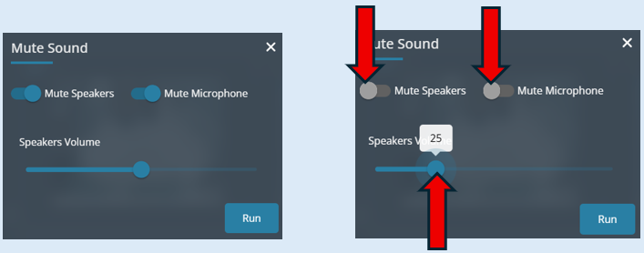 Select the ‘Mute Sound’ icon. Switch both mute buttons to the ‘Off’ position then set the ‘Speakers Volume’ level by sliding the button to the desired volume. Select ‘Run’.
